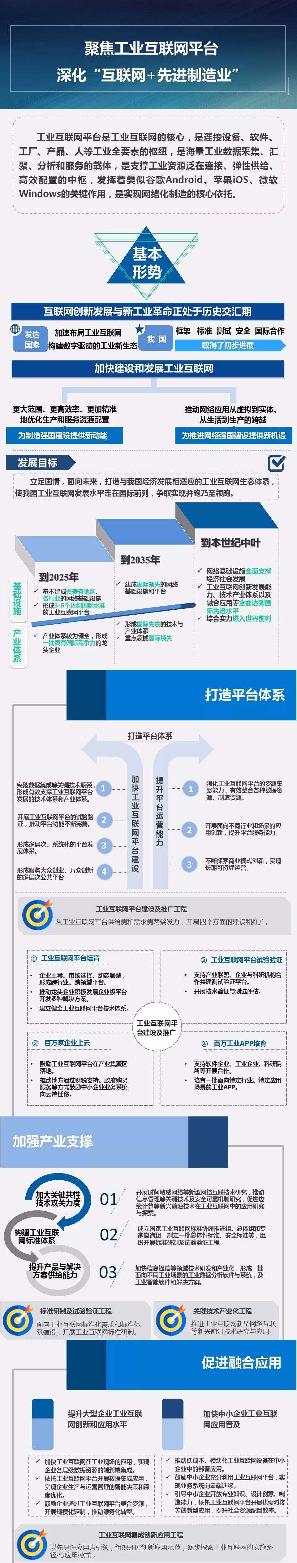 在总体目标方面,从“建平台”和“用平台”两个角度,提出平台发展的绩效目标。到2025年,重点工业行业实现网络化制造,工业互联网平台体系基本完善,形成3-5家具有国际竞争力的工业互联网平台,培育百万工业APP,实现百万家工业企业上云,形成“建平台”和“用平台”双向迭代、互促共进的制造业新生态。