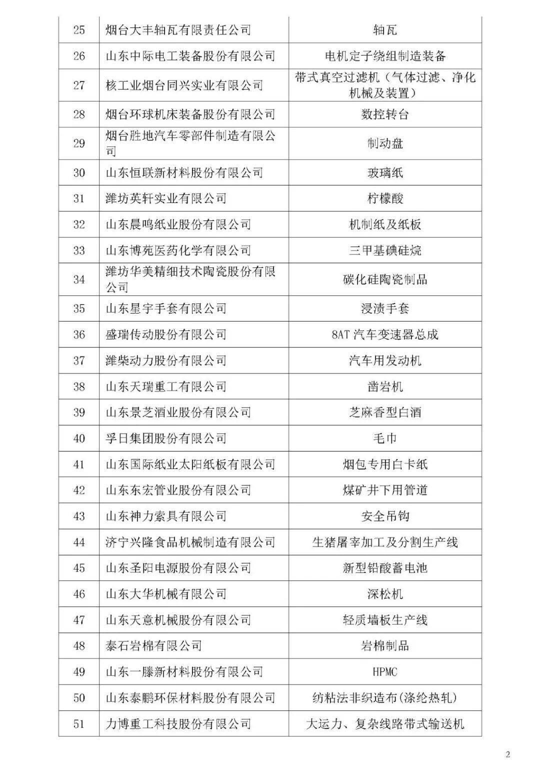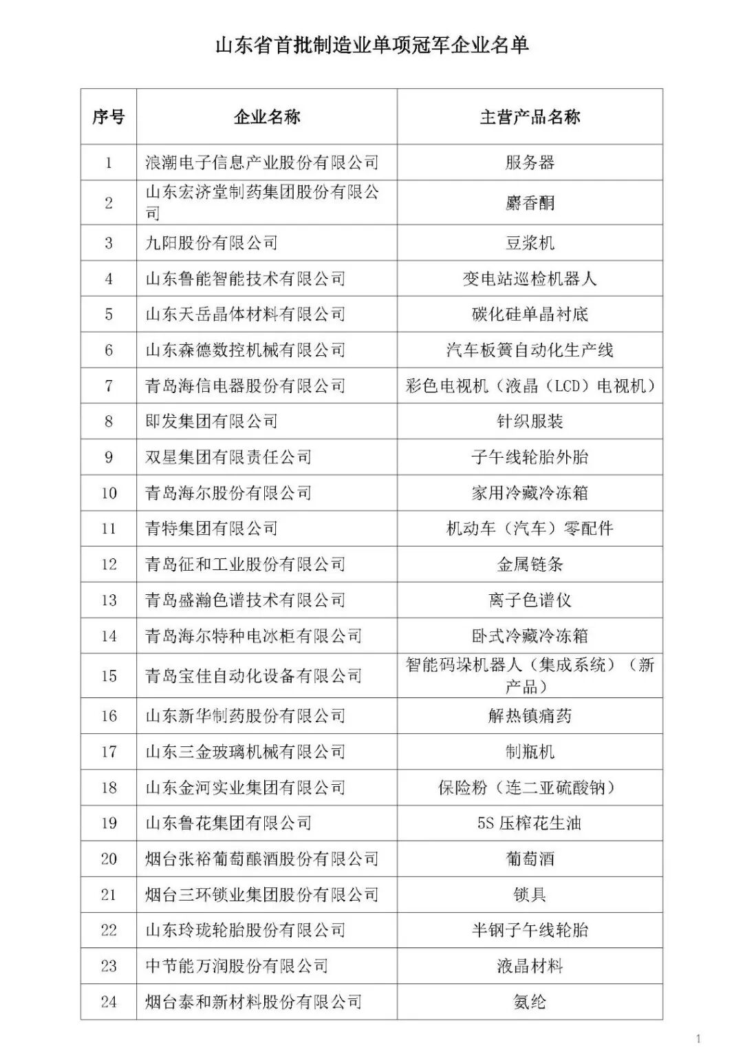 为贯彻落实《中国制造2025》,引导制造业企业专注于细分产品领域精耕细作,根据《山东省制造业单项冠军企业培育提升专项行动实施方案》(鲁经信产〔2017〕143号),经企业自主申报、各市经济和信息化委及有关行业协会推荐、专家评审和网上公示等程序,确定了山东省首批制造业单项冠军企业名单,现予公布。